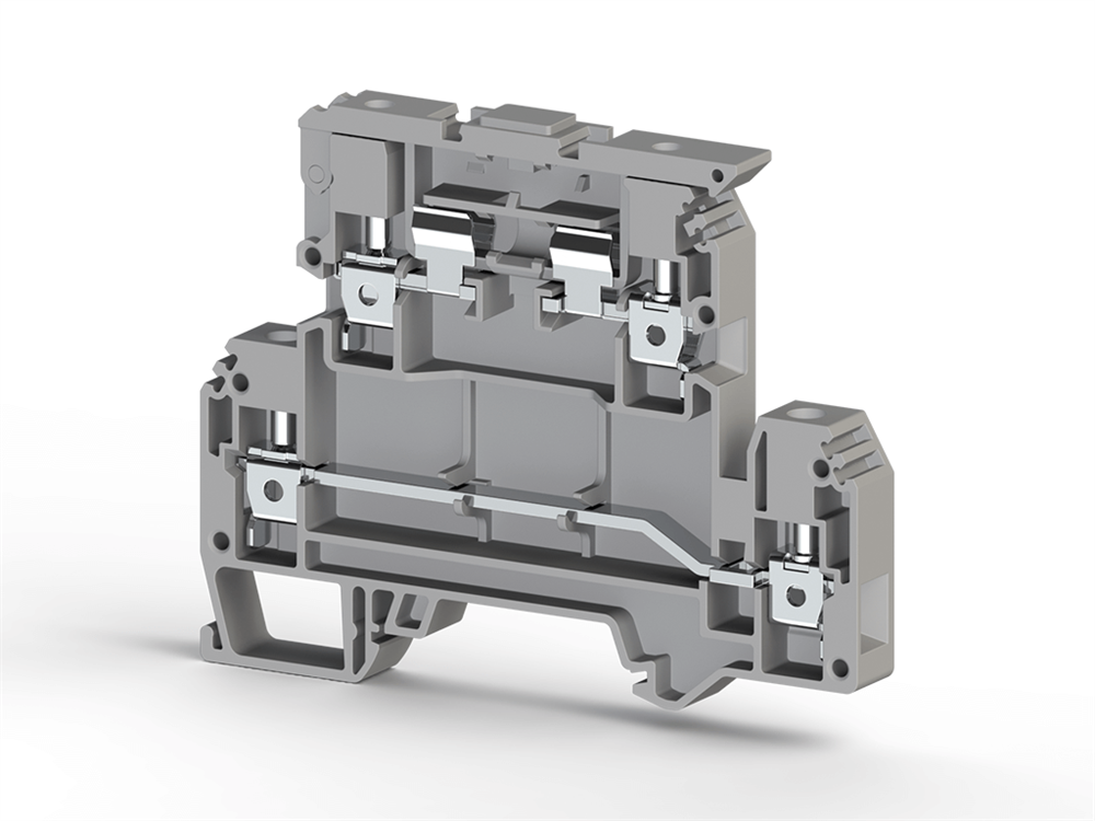 Клеммник 2-х ярусный с держ. предохр. (5х20, 5х25) на DIN-рейку, 4 мм.кв., (серый); AVK 4FS