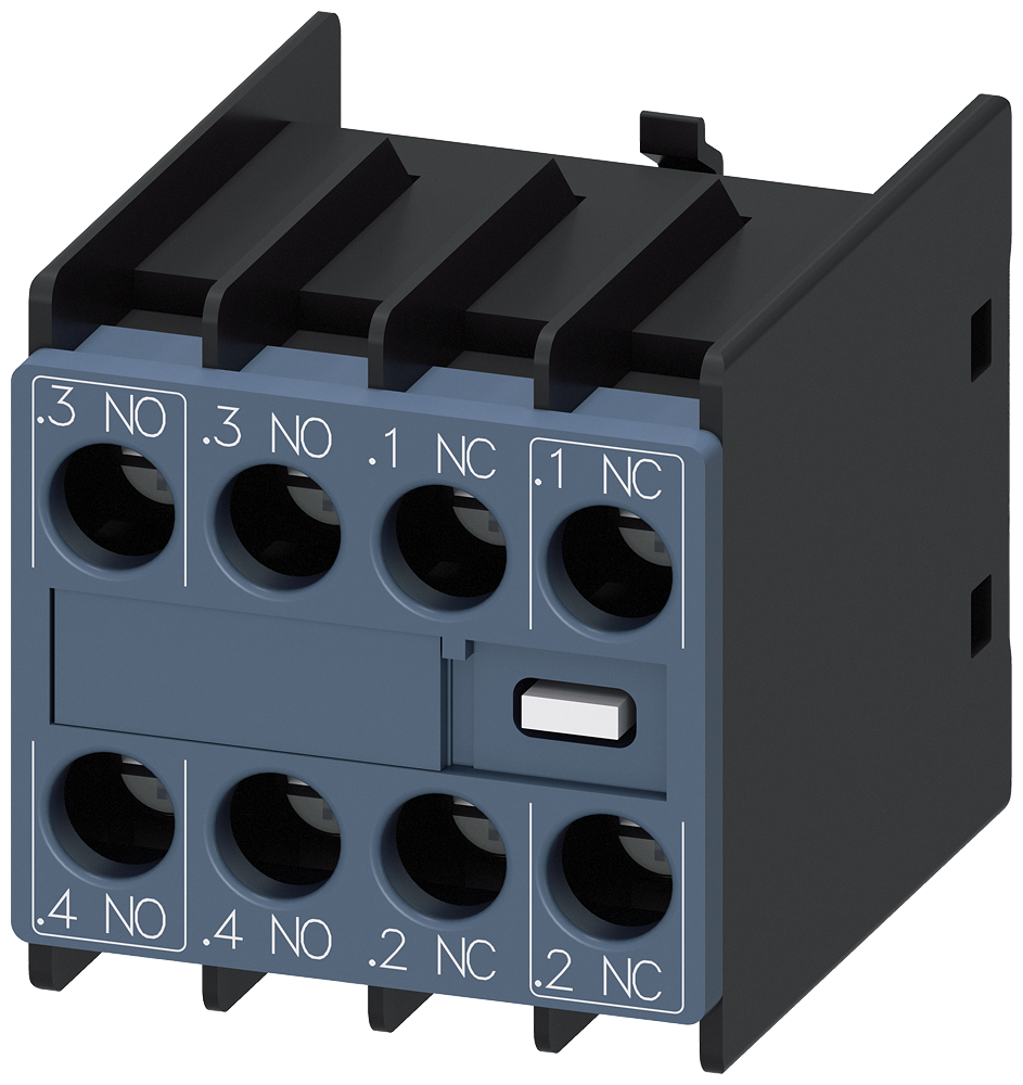 Auxiliary switch on the front, 2 NO + 2 NC Current path 1 NO, 1 NO, 1 NC, 1 NC for 3RH and 3RT screw terminal .3/.4, .3/.4, .1/.2, .1/.2