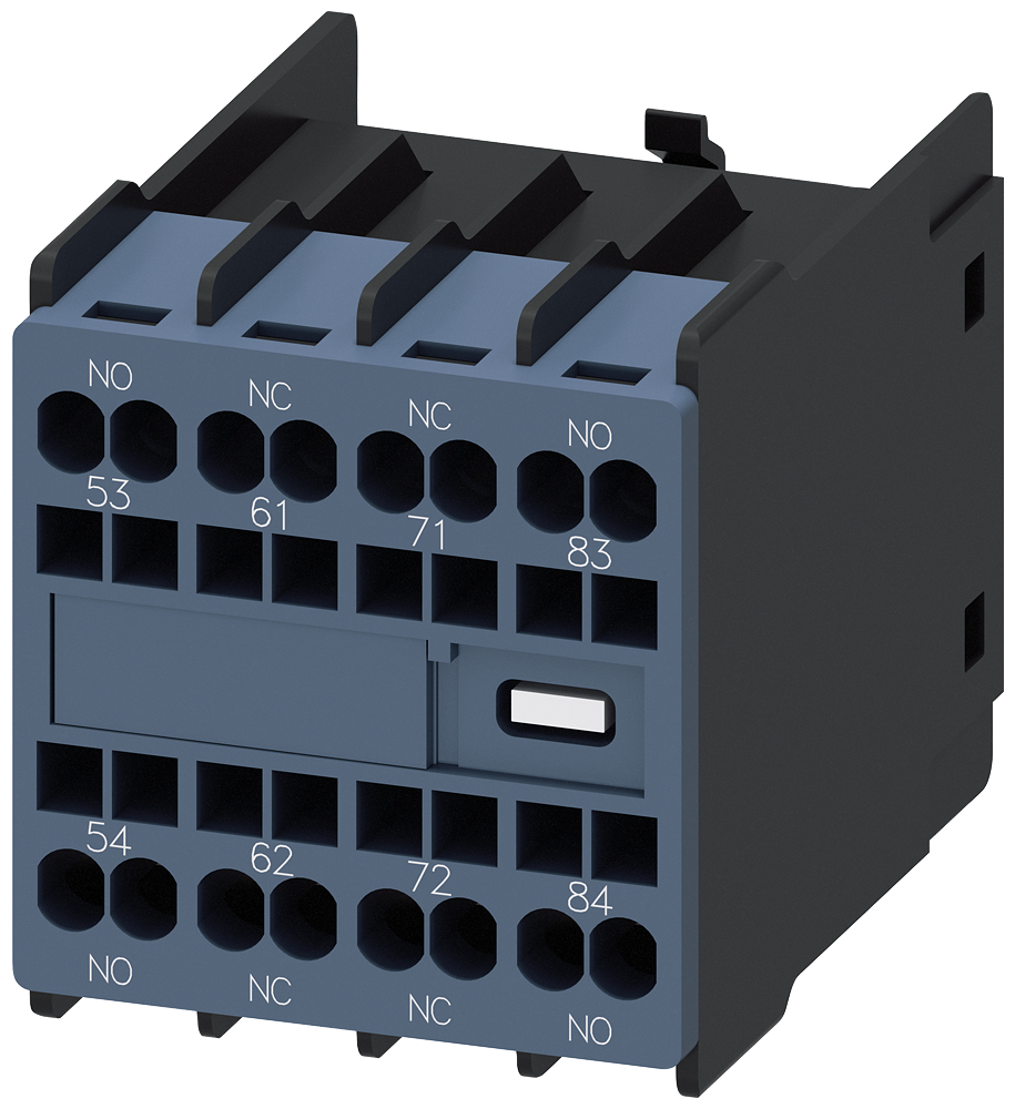 Auxiliary switch on the front, 2 NO + 2 NC Current path 1 NO, 1 NC, 2 NC, 1 NO for 3RH and 3RT spring-type terminal 53/54, 61/62, 71/72, 83/84