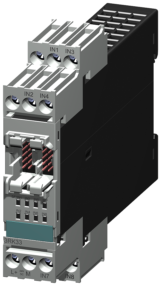 SIRIUS, Extension module 3RK33 for modular Safety system 3RK3 8 DI, 24 V DC Can be parameterized via MSS ES 22.5 mm overall width screw terminal without connection cable