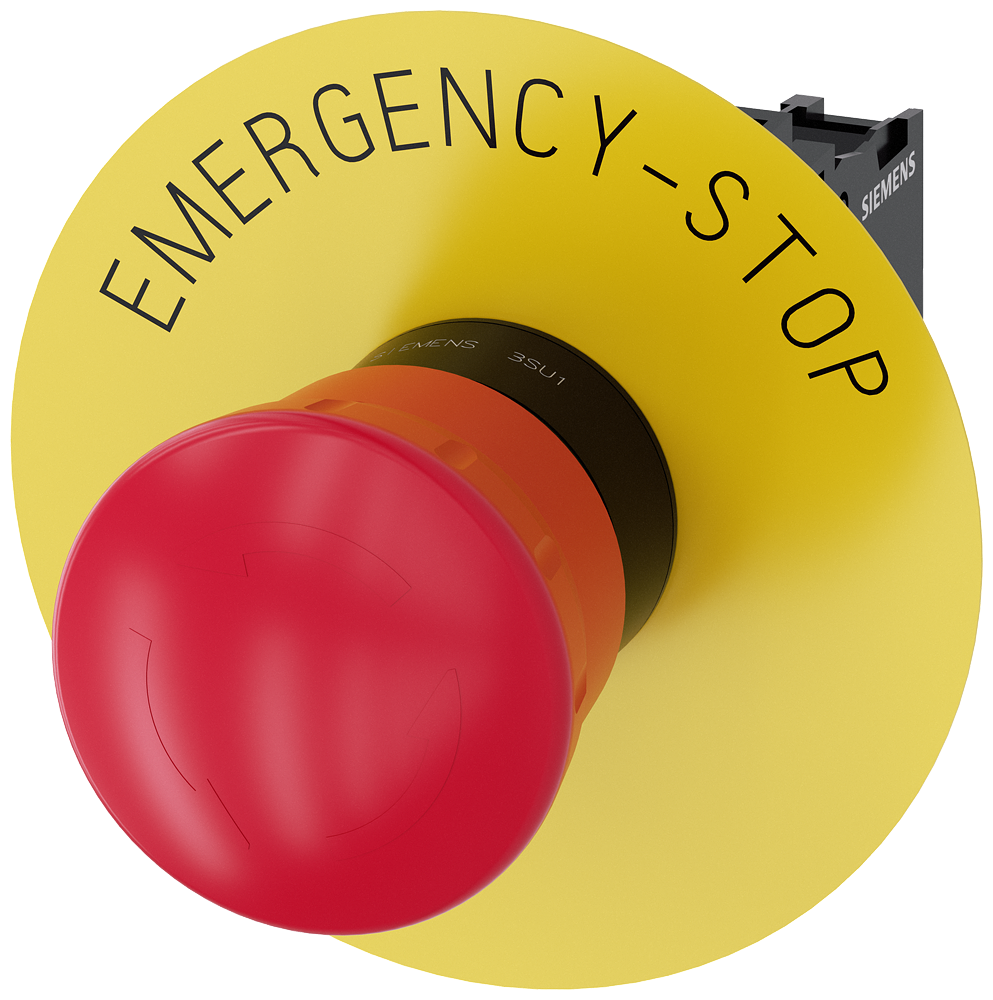 АВАРИЙНАЯ ГРИБОВИДНАЯ КНОПКА, 22MM, КРУГЛАЯ, ПЛАСТИК, КРАСНАЯ, 40MM, С ФИКСАЦИЕЙ, POSITIVE LATCHING, ДЕБЛОКИРОВКА ПОВОРОТОМ, С ЖЁЛТОЙ ПОДЛОЖКОЙ, НАДПИСЬ: EMERGENCY STOP, С ДЕРЖАТЕЛЕМ, 1NC, ВИНТОВЫЕ КЛЕММЫ