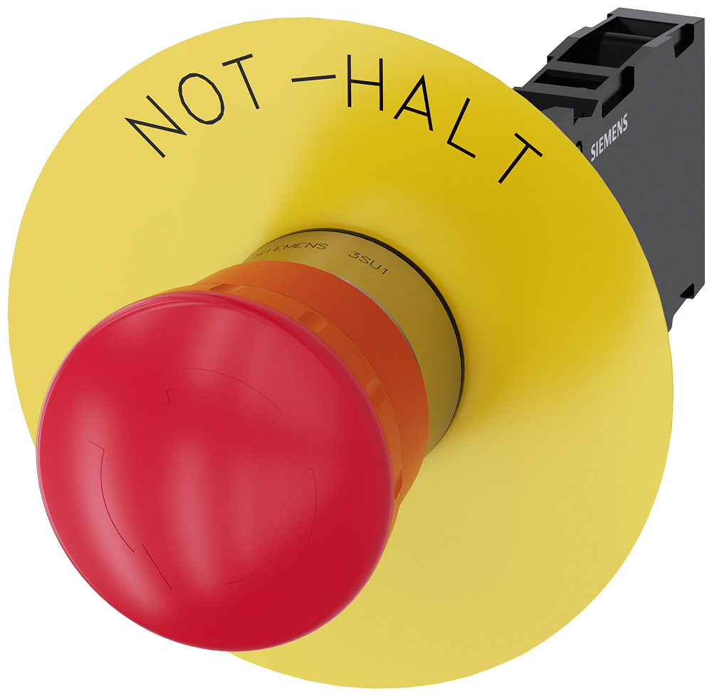 АВАРИЙНАЯ ГРИБОВИДНАЯ КНОПКА, 22MM, КРУГЛАЯ, МЕТАЛЛИЧЕСКАЯ ГЛЯНЦЕВАЯ, КРАСНАЯ, 40MM, С ФИКСАЦИЕЙ, ДЕБЛОКИРОВКА ПОВОРОТОМ, С ЖЁЛТОЙ ПОДЛОЖКОЙ, НАДПИСЬ: NOT-HALT, С ДЕРЖАТЕЛЕМ, 1NO+1NC, ВИНТОВЫЕ КЛЕММЫ