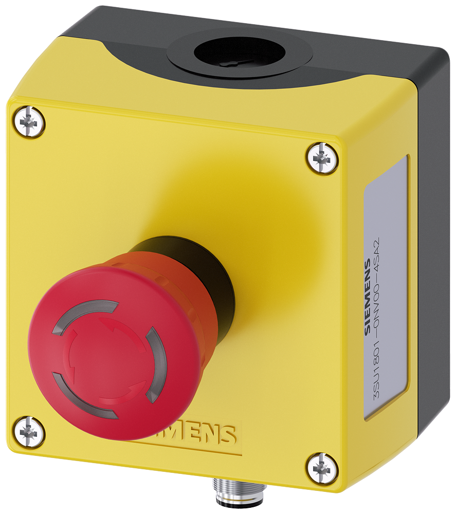 Enclosure for command devices, 22 mm, round, enclosure material plastic, enclosure top part yellow, 1 control point plastic, A=EMERGENCY STOP mushroom pushbutton red, 40 mm, rotate-to-unlatch, illuminated, 2x 1 NC, LED white 24 V, spring-type terminal, floor mounting, M12 connector (8-pole) bottom, insulated reserve conductors Pin assignment: PIN1=11, PIN2=12, PIN3=21, PIN4=22, Pin5=n.c., Pin6=n.c., Pin7=ground LED, PIN8=LED, one connection at 1 input F-DI, one connection at 1 output F-DQ