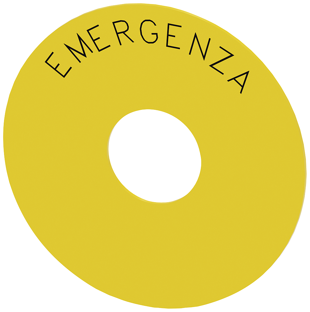 ПОДЛОЖКА ДЛЯ КНОПОК АВАРИЙНОГО ОСТАНОВА, ЖЕЛТАЯ, САМОКЛЕЯЩАЯСЯ, НАРУЖНЫЙ ДИАМЕТР 75MM, ДИАМЕТР ОТВЕРСТИЯ 23MM, С МАРКИРОВКОЙ: EMERGENZA