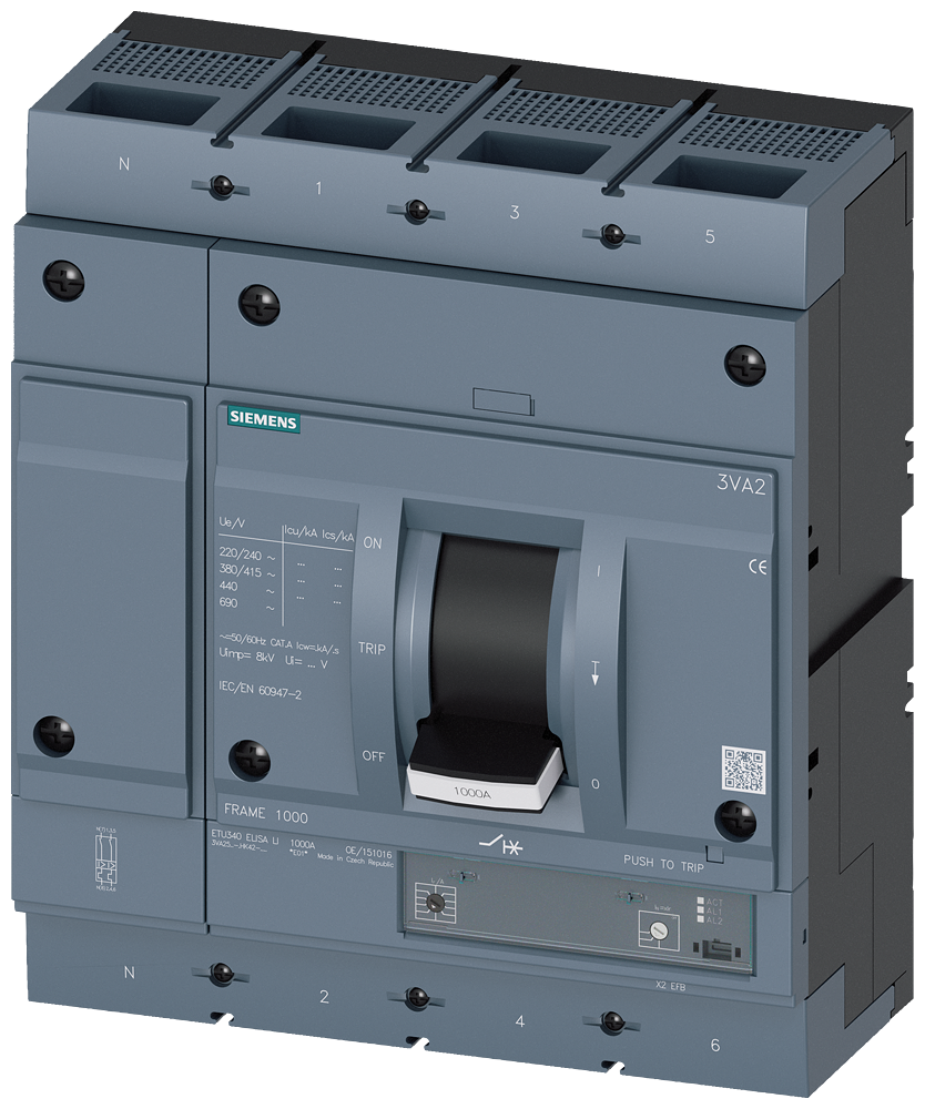 Автоматический выключатель 3VA2 IEC Frame 1000 Switching capacity class M Icu=55 kA @ 415 V 4-pole, system protection ETU340, ELISA LI, In=1000 A Overload protection Ir=400 A...1000 A short-circuit protection Ii=10 x In N-conductor protection adjustable (OFF, 50%, 100%) Lug terminal