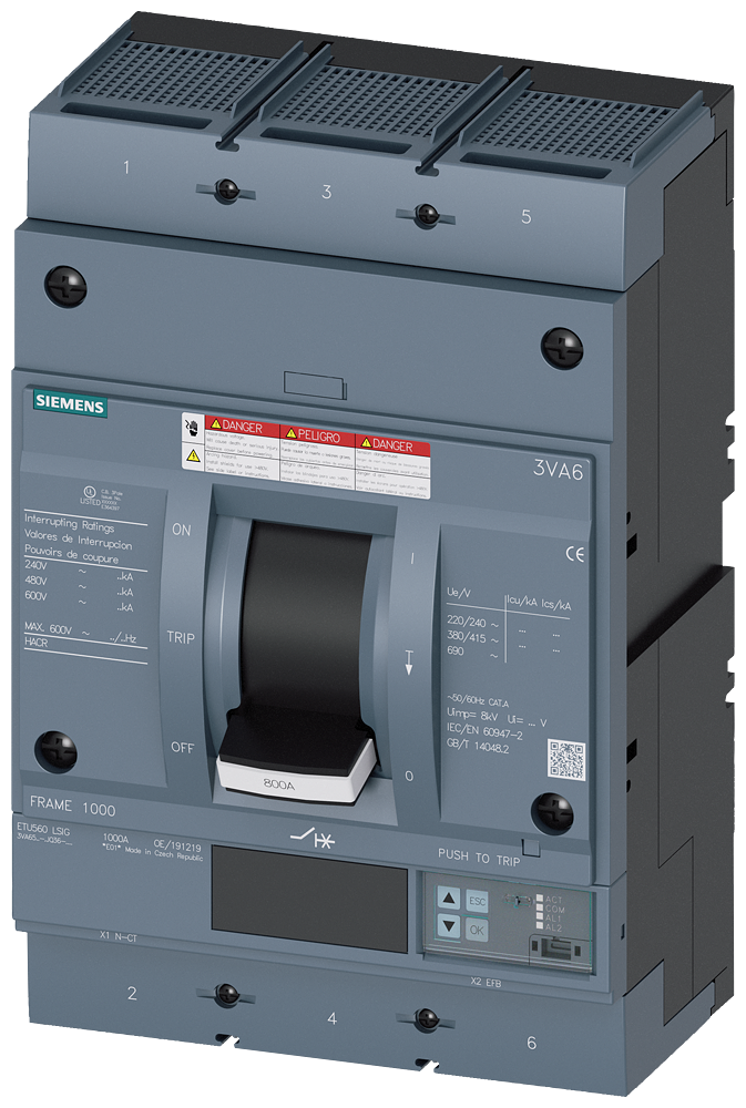 circuit breaker 3VA6 UL Frame 800 breaking capacity class H 65 kA @ 480 V 3-pole, line protection ETU560, LSIG, In=600 A overload protection Ir=240 A ...600 A short-circuit protection Isd=0.6..12x In, Ii=1.5..12x In neutral conductor protection optionally with ext. CT up to 160% ground-fault protection IG=0.2... 1xIn, tg=0.05-0.8s cable connection on two sides