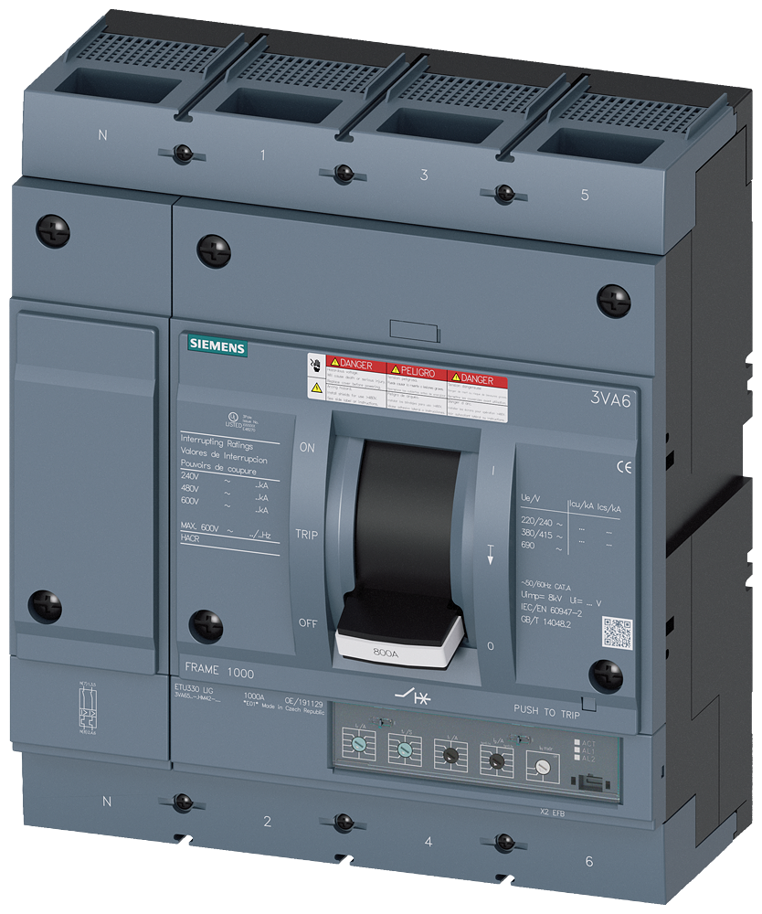 circuit breaker 3VA6 UL Frame 800 breaking capacity class H 65 kA @ 480 V 4-pole, line protection ETU330, LIG, In=800 A overload protection, 100% rated Ir=315 A ...800 A short-circuit protection Ii=1.5...10 x In neutral conductor protection adjustable (OFF, 50%, 100%) ground-fault protection IG=0.2... 1xIn, tg=0.1/0.3s nut keeper kit