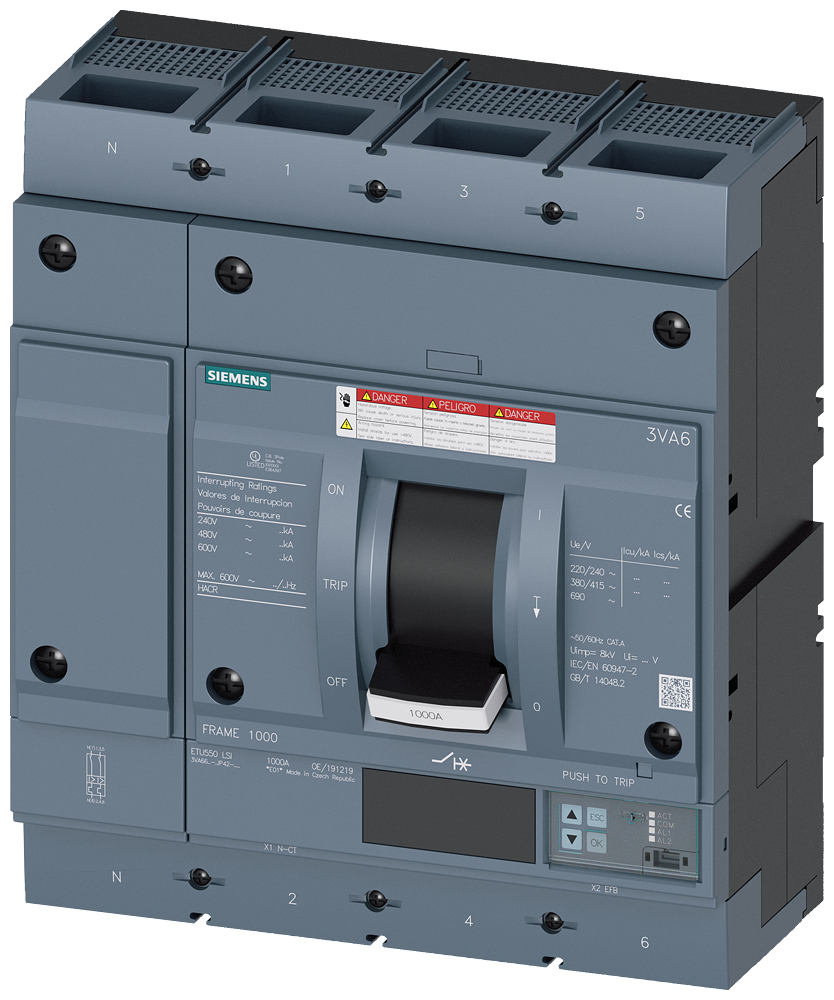 circuit breaker 3VA6 UL Frame 1000 breaking capacity class M 35 kA @ 480 V 4-pole, line protection ETU550, LSI, In=1000 A overload protection Ir=400 A ...1000 A short-circuit protection Isd=0.6..10x In, Ii=1.5..10x In neutral conductor protection adjustable (OFF, up to 160%) nut keeper kit