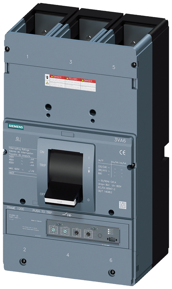 circuit breaker 3VA6 UL frame 1200 breaking capacity class C 100kA @ 480 V 3-pole, line protection ETU350, LSI, In=1000A overload protection Ir=400A - 1000A short circuit protection Isd=1,5-10 x Ir, Ii=1,5 x In w/o connection
