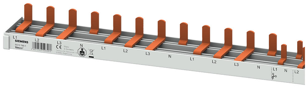 compact Pin Busbar, 10mm2 connection: 3p/N (RCCB N-right) 1x RCCB 4-pole+2x MCB 4-pole+ 12x compact device 1MW touch protected 24 MW cuttable