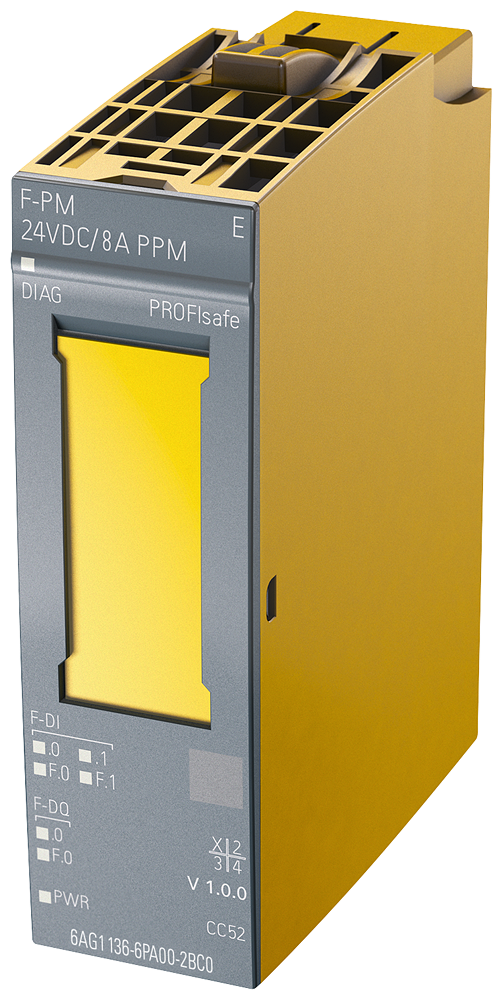 SIPLUS ET 200SP, модуль питания F-PM-E, рабочая температура -25 ... +60°C, со стойким покрытием, на основе 6ES7136-6PA00-0BC0 . модуль питания F-PM-E, PPM PROFISAFE, =24 В, отказобезопасное включение выходов DQ и F-DQ, для отказобезопасных систем вплоть до PL D / SIL2 или PL E / SIL3, 2 отказобезопасных дискретных входа, 1 отказобезопасный дискретный выход