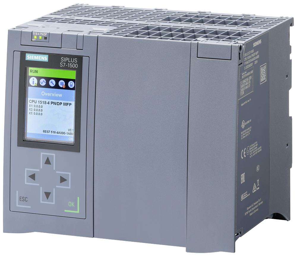 SIPLUS S7-1500 CPU 1518-4 PN/DP MFP based on 6ES7518-4AX00-1AB0 with conformal coating, 0…+60 °C, central processing unit with C/C++ Runtime preinstalled, work memory 4 MB for program and 20 MB for data, 1st interface: PROFINET IRT with 2-port switch, 2nd interface: PROFINET RT, 3rd interface: Ethernet, 4th interface: PROFIBUS, 1 ns bit performance, SIMATIC Memory Card (min. 2 GB) required