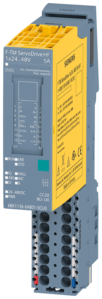 SIMATIC F-TM ServoDrive HF, drive controller for servo and stepper motors in safety low-voltage area, 24 to 48 V DC power supply of the drive, rated current 5A, for SIMATIC ET 200SP, STO hardwired