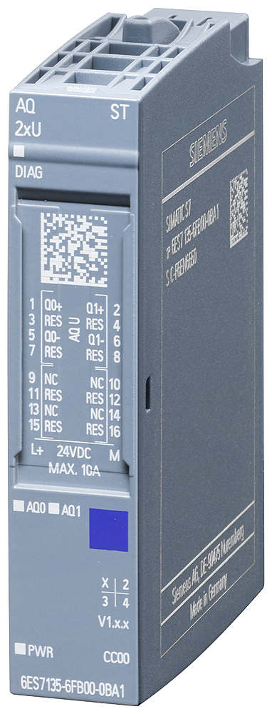 SIMATIC ET 200SP, МОДУЛЬ АНАЛОГОВОГО ВЫВОДА, AQ 2X U ST, НАПРЯЖЕНИЕ, СТАНДАРТНЫЙ, УПАКОВКА ПО 1 ШТ., ДЛЯ УСТАНОВКИ НА БАЗОВЫЕ БЛОКИ ТИПА A0, A1, ЦВЕТОВОЙ КОД CC00, ДИАГНОСТИКА МОДУЛЯ, 16 БИТ