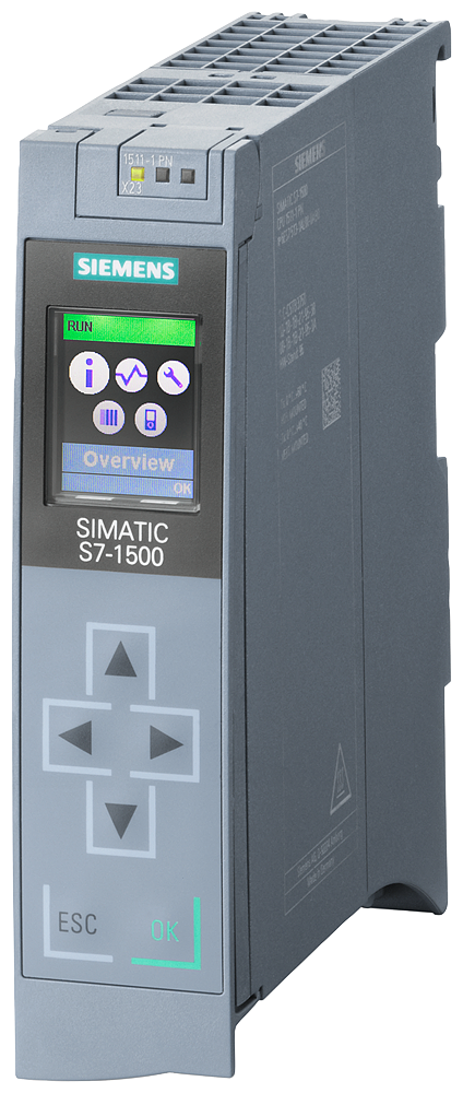 SIMATIC S7-1500, процессор 1511-1 PN, центральный процессор с рабочей памятью 150 КБАЙТ для программ и 1 МБ для данных, 1-й интерфейс: PROFINET IRT с 2-портовым коммутатором, производительность в битах 60 нс, требуется карта памяти SIMATIC
