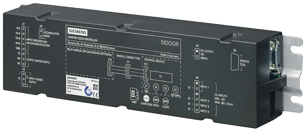 SIDOOR AT400T контрольный модуль с релейными выходами для внутренних дверей вагона поезда. Макс. вес двери 400кг. 36VDC, 1*RS485, 4*DI, 3*реле, 1*24VDC вывод, -20°C .. +50°C, EN 50155, EN 50121-3-2, EN 45545-2, EN 61373