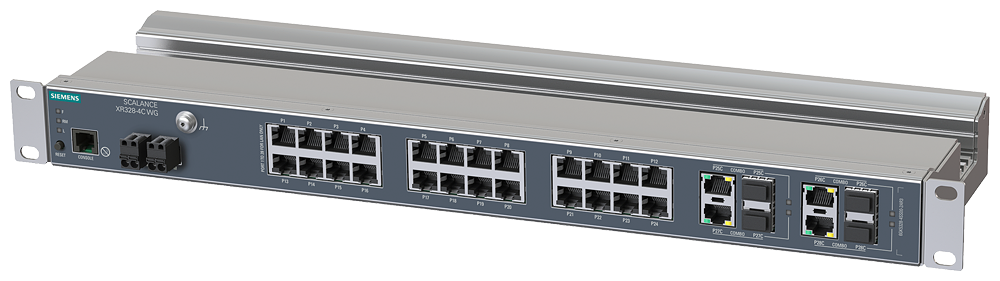 SCALANCE XR328-4C WG; managed IE switch; 19" rack; 24 x 10/ 100/1000 Mbit/s electrical ports; 4 x 1000 Mbit/s Combo Ports electrical or optical; LED diagnostics; Reset button; console port; PROFINET device; network management function; redundancy manager; Power supply 24 V DC