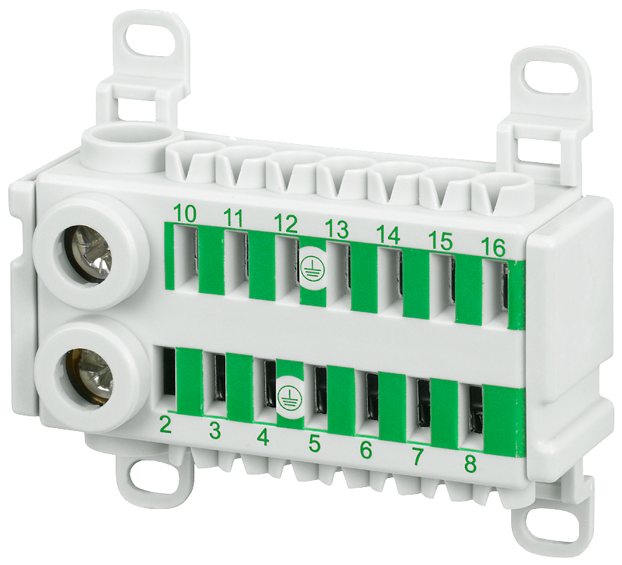 ALPHA 400-ZS PE terminal 14-pole, 2x 14 mm2 screw terminals, 14x 4 mm2 plug-in terminals, horizontal installation or vertically on DIN rail, color green