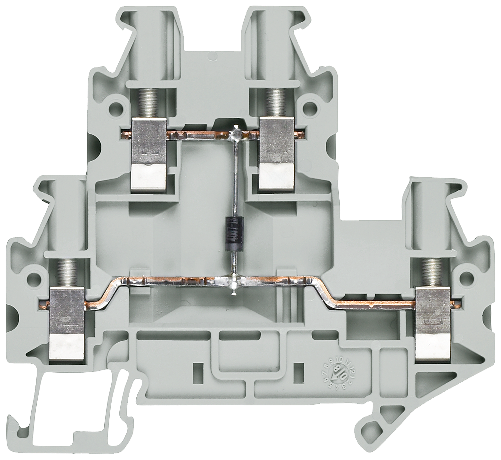 Two-tier diode terminal with screw terminal Terminal size 2.5 mm2 Terminal width 5.2 mm Color gray with diodes Passage from top to bottom