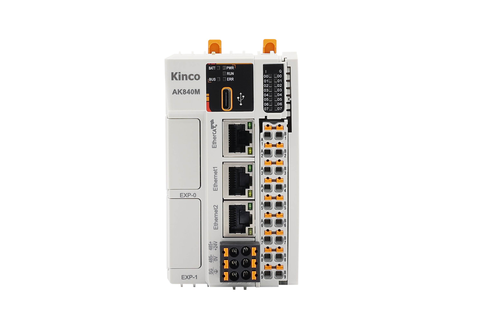 Программируемый логический контроллер Kinco серии AK8X0, напряжение питания 24 В DC, 8 DI, 8 DO (транзисторные 0,5 А), встроенные интерфейсы и протоколы связи, 2xEthernet, 1xEtherCAT, 1xRS485, 1xUSB host, Modbus TCP (Client/Server), Modbus RTU (Master/Slave), синхронногое управление по осям до 32, подключение до 16 модулей ввода/вывода серии RP20, общие количество каналов ввод/вывод (с учётом модулей ввода/вывода) до 272, среда разработки CODESYS, языки программирования IL, ST, LD, FBD, SFC, объём прикладного программного обеспечения до 32 Мбайт, ВхШхГ 109x54x80 мм