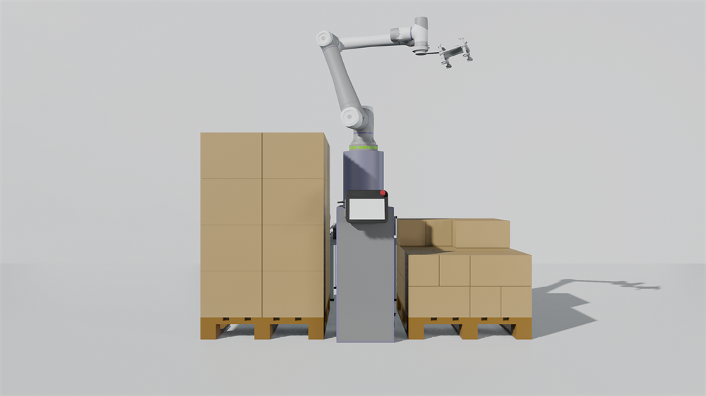 - Доступна адаптация роботизированной ячейки под формфактор укладываемых на паллету изделий и под ваши задачи (работа с одной или двумя паллетами захват короба или единичной продукции послойное паллетирование и т. д.)