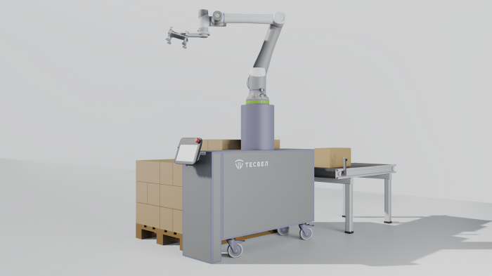 Роботизированная ячейка на базе коллаборативного робота предназначена для паллетирования продукции. Преимущества такого решения — наличие всего необходимого для работы в комплекте поставки и быстрый ввод оборудования в эксплуатацию. Интеграция роботизированной ячейки на производство занимает не более одного дня.