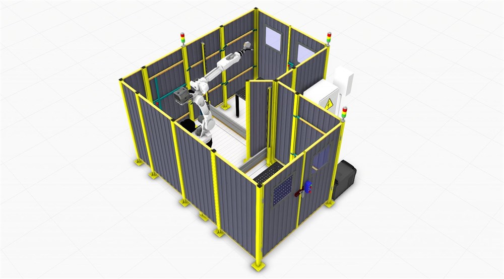 Комплекс включает в себя: промышленный робот-манипулятор, сварочное оборудование, два перфорированных сварочных стола 1500*1000 мм, систему безопасности с защитными ограждениями и световыми барьерами, шкаф силовой и пульт управления с HMI панелью.